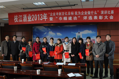 受表彰的先進(jìn)女職工和公司領(lǐng)導一起合影 3月5日,枝江酒業(yè)組織開(kāi)展了慶“三八”系列活動(dòng)。表彰了一批獲得2012年度“巾幗建功”先進(jìn)個(gè)人,開(kāi)…