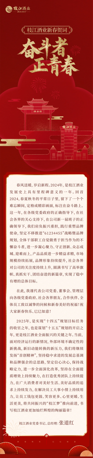 1月22日上午,集團董事長(cháng)昝圣達聽(tīng)取了張道紅總經(jīng)理代表枝江酒業(yè)管理層所作的2024年工作匯報和2025年工作安排。枝江酒業(yè)管理層的其他負責人也…
