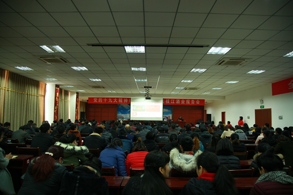 為進(jìn)一步將學(xué)習宣傳貫徹黨的十九大精神引向深入,更好地用習近平新時(shí)代中國特色社會(huì )主義思想武裝頭腦,指導和推動(dòng)枝江酒業(yè)改革發(fā)展和黨建工作,12月7日,枝江酒業(yè)舉辦學(xué)習貫徹黨的十九大精神報告會(huì )。特邀黨的十九大精神市委宣講團成員、市直機關(guān)工委常務(wù)副書(shū)記楊義華為公司干部職工作了一場(chǎng)精彩生動(dòng)的宣講報告。報告由公司黨委委員、董事會(huì )秘書(shū)劉先鵬主持。公司領(lǐng)導蔣紅星、張華、劉前生、亓新明、楊家法參加報告會(huì ),公司各部門(mén)、車(chē)間負責人及黨員干部和職工代表共300多人聆聽(tīng)了報告會(huì )。